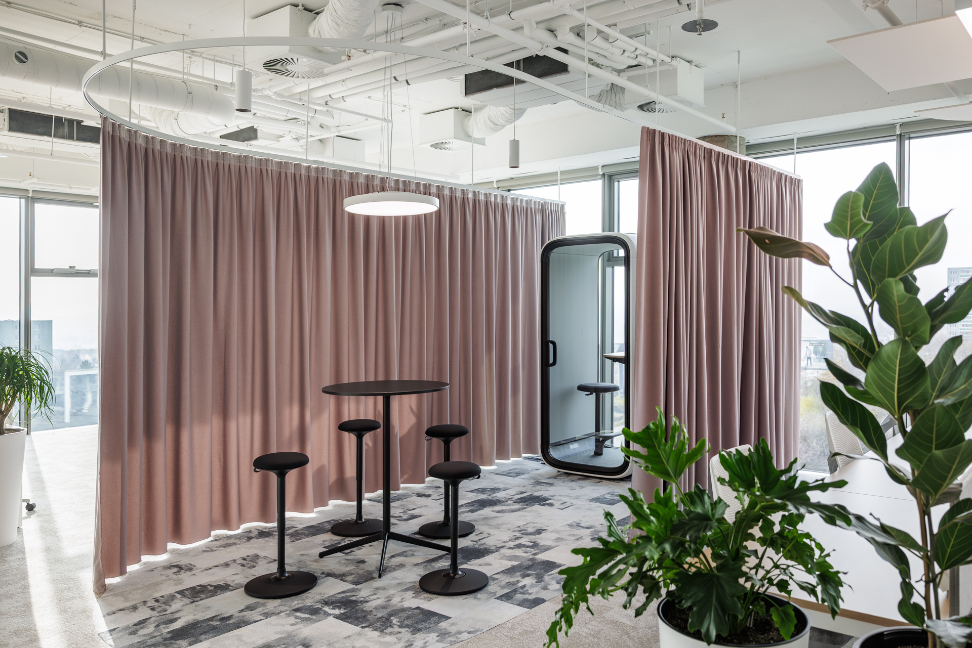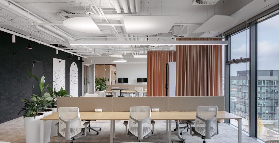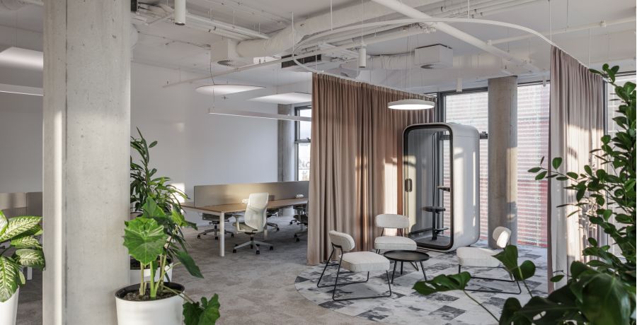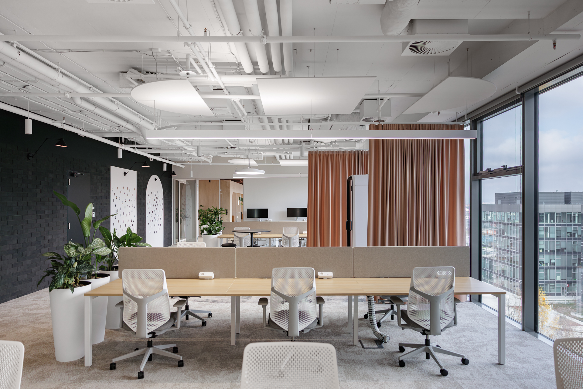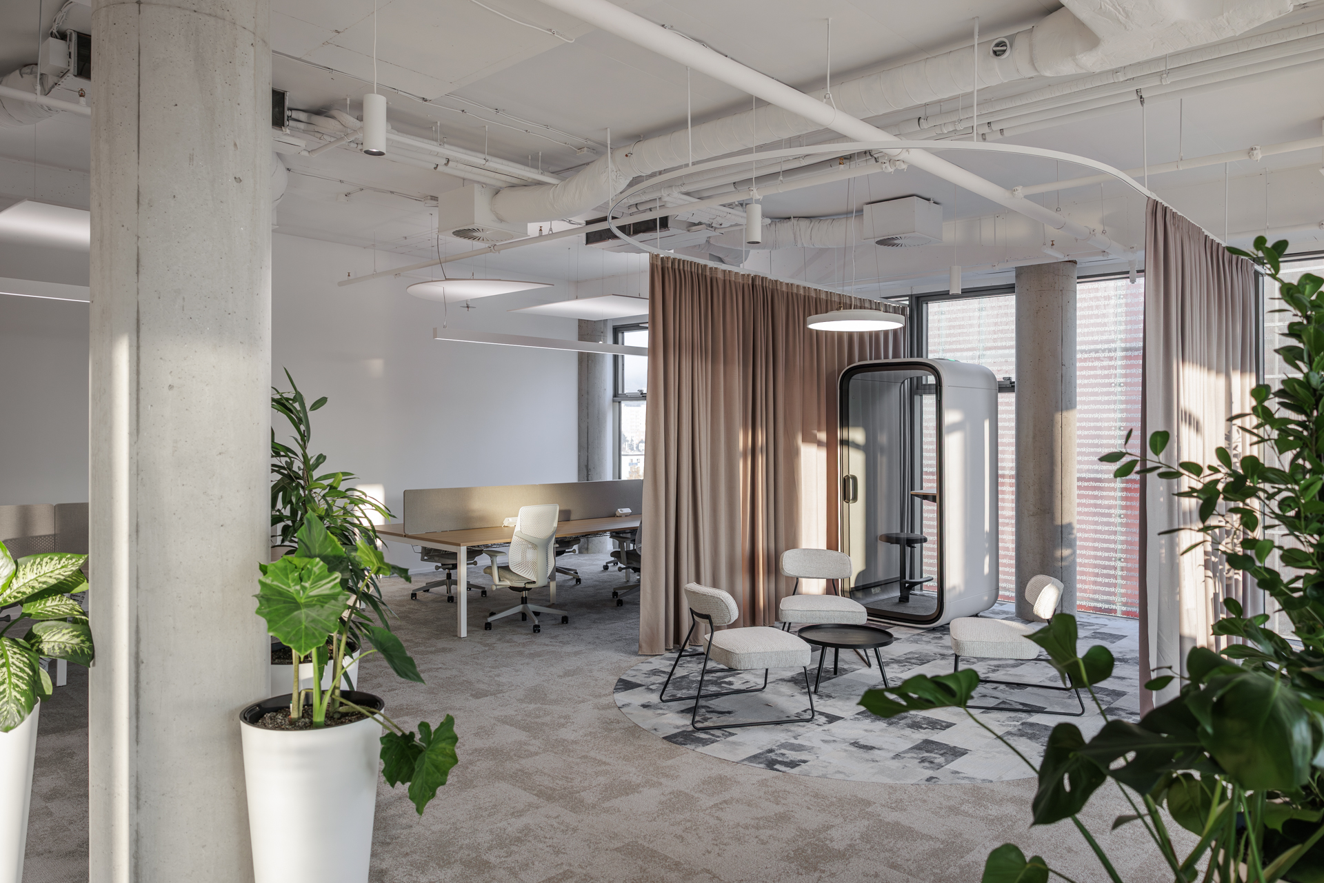 Materiálová paleta kombinuje měkké textilie, dřevo a industriální prvky otevřených instalací, které společně vytvářejí vyvážené pracovní prostředí s lidským měřítkem.