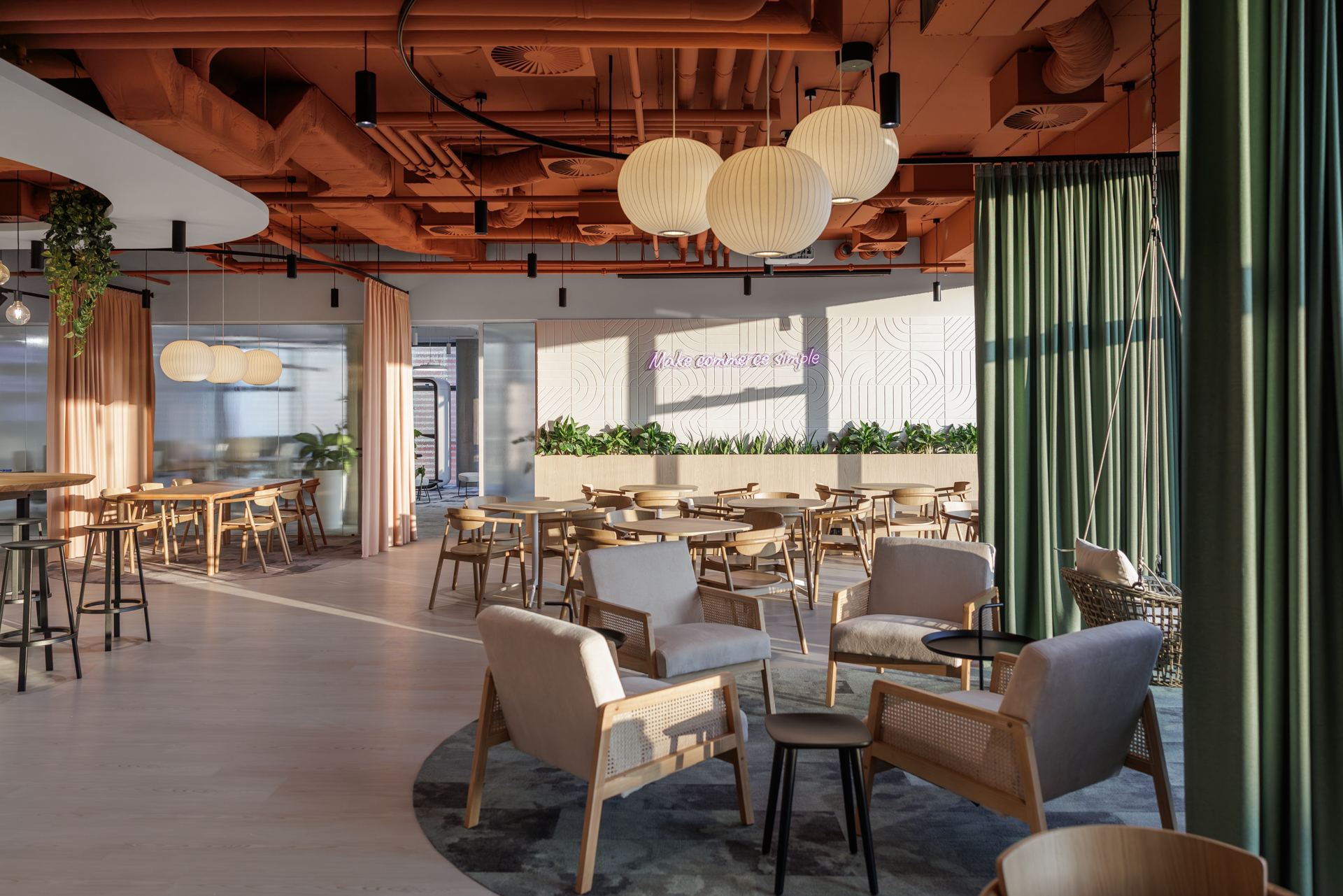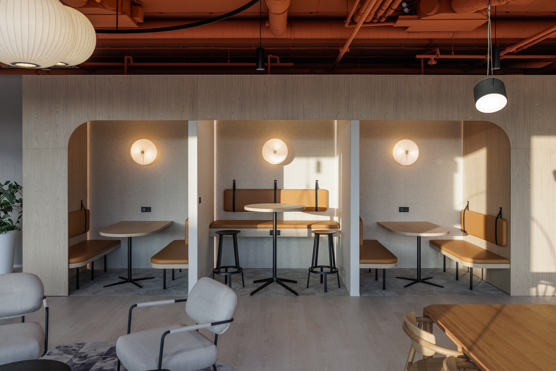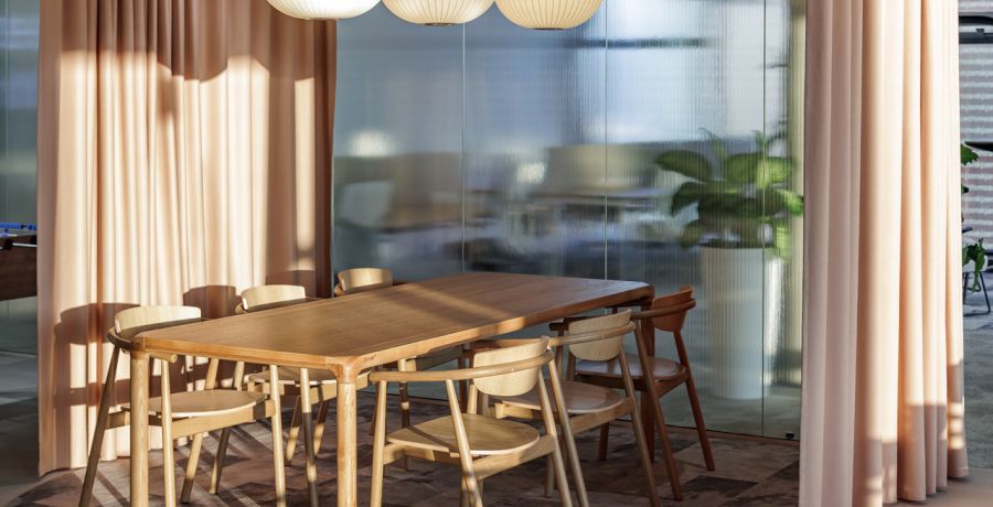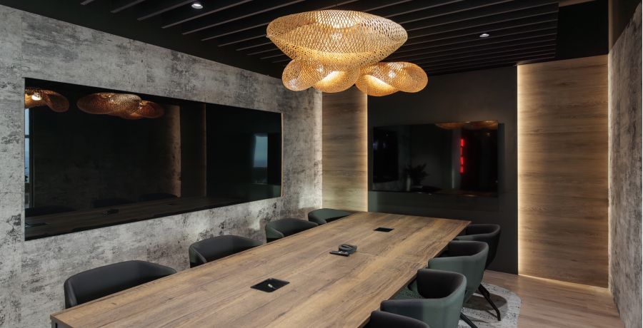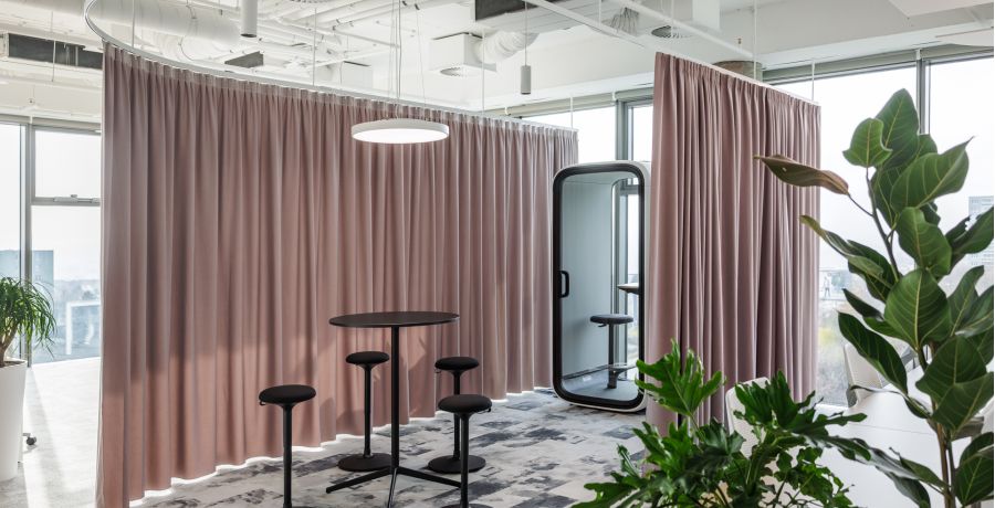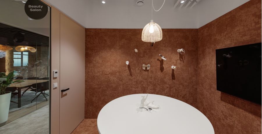Materiálová paleta kombinuje měkké textilie, dřevo a industriální prvky otevřených instalací, které společně vytvářejí vyvážené pracovní prostředí s lidským měřítkem.