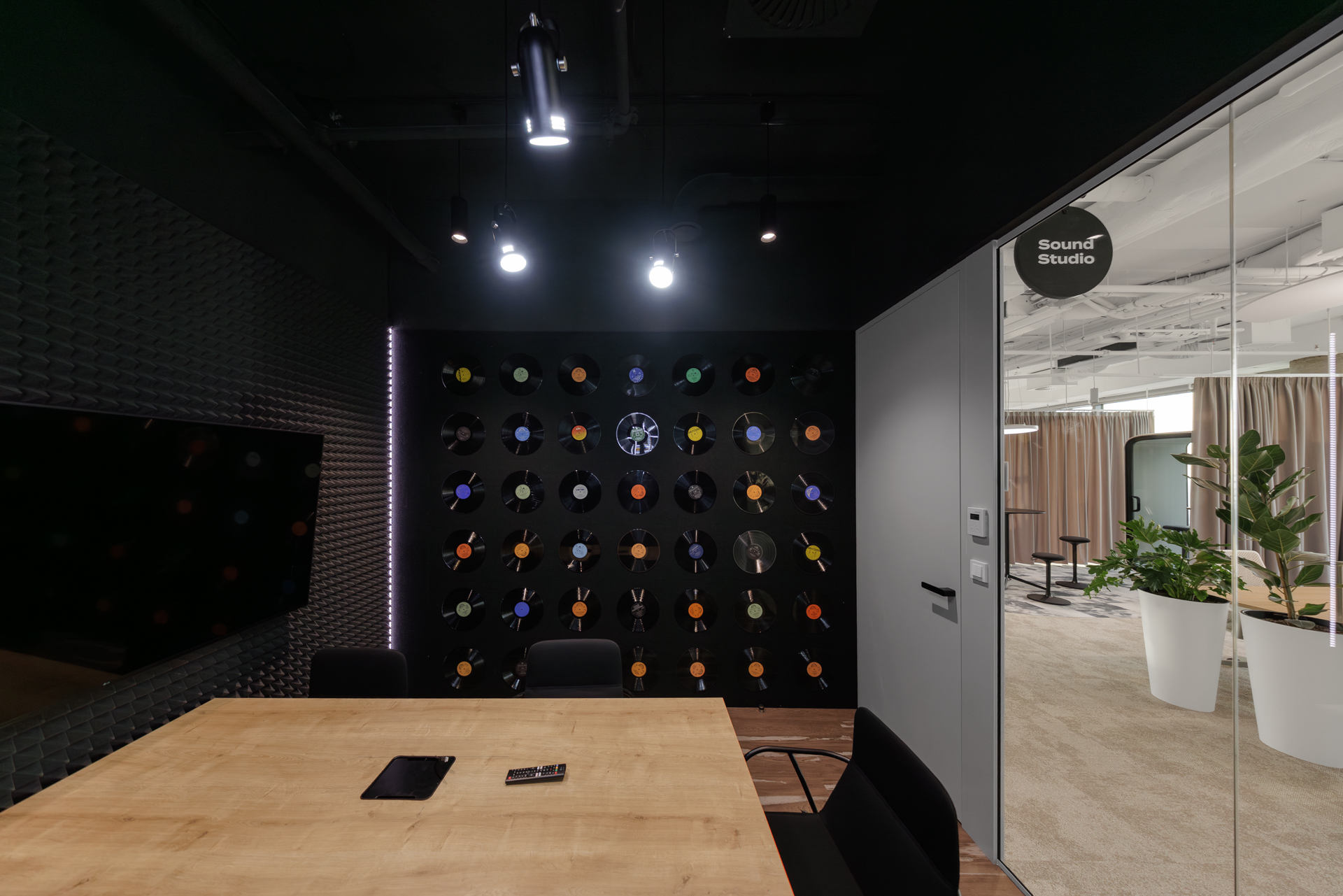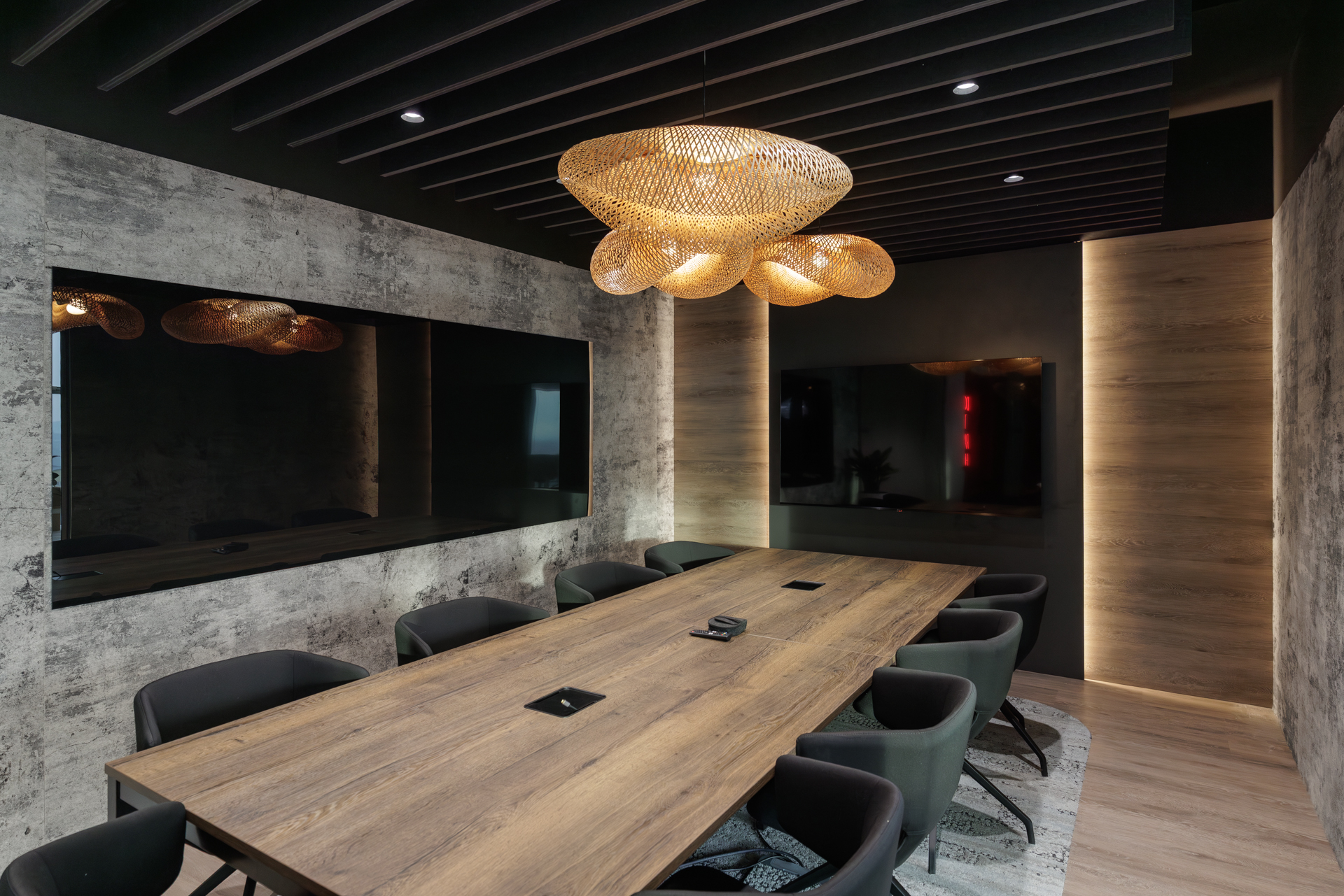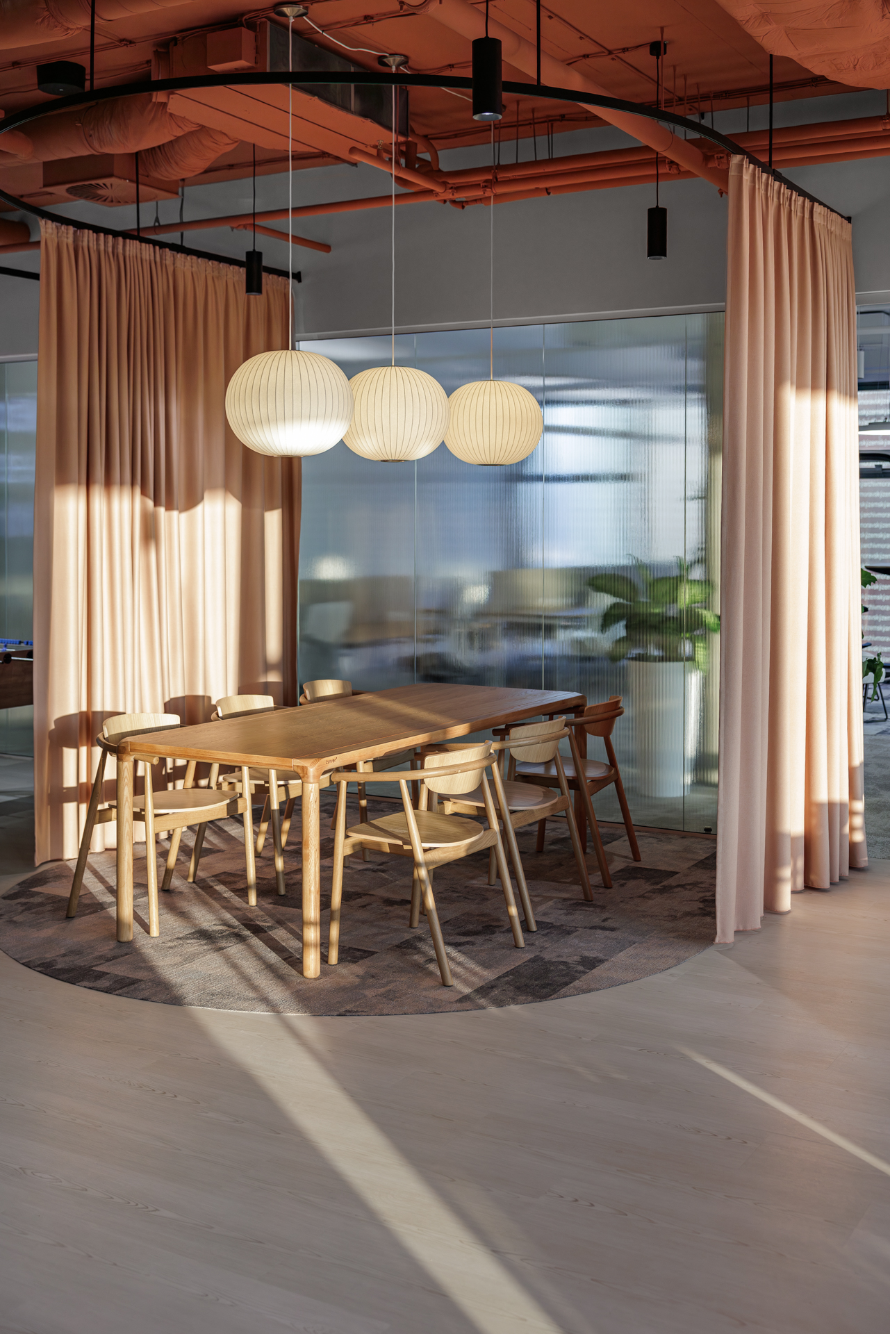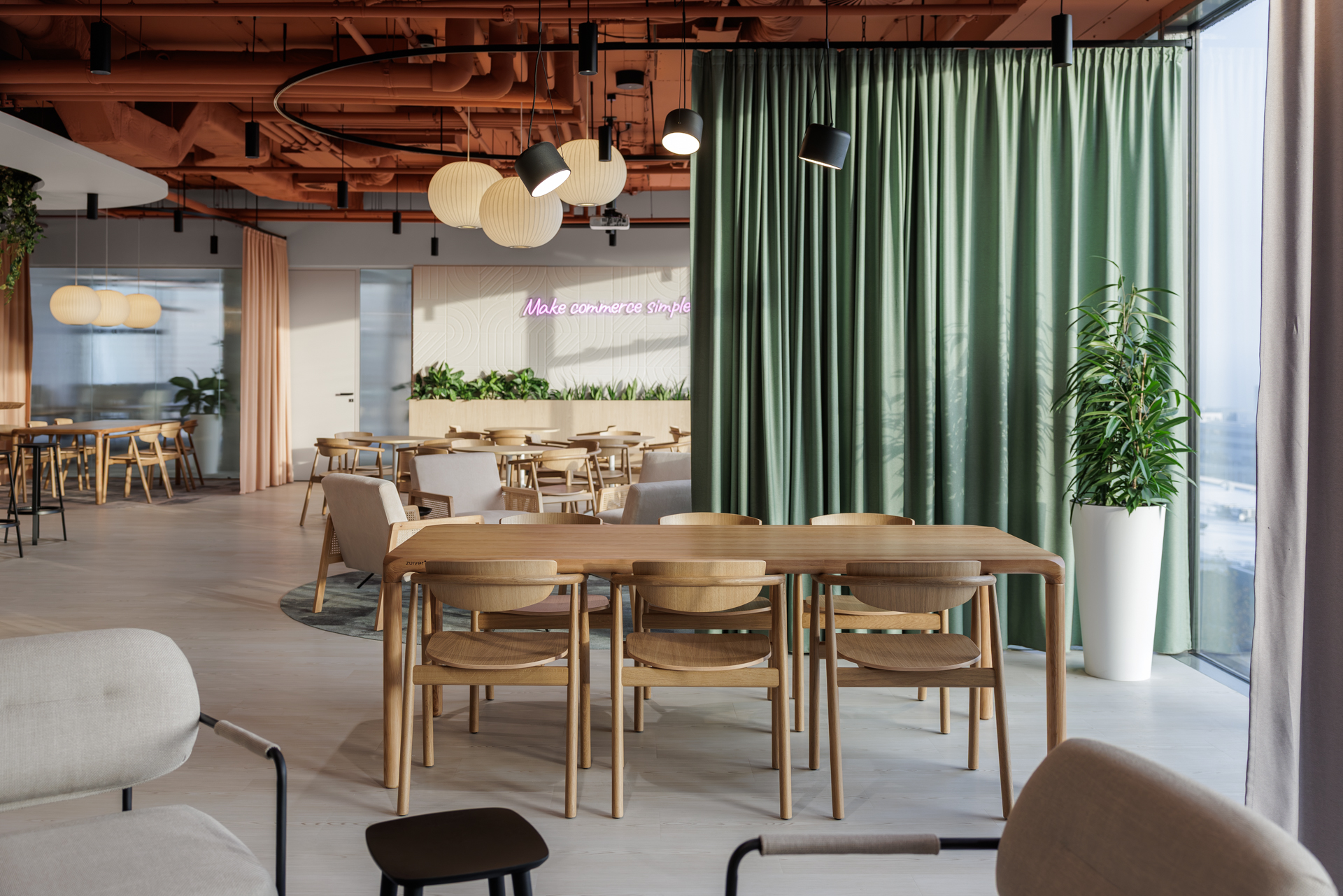 Materiálová paleta kombinuje měkké textilie, dřevo a industriální prvky otevřených instalací, které společně vytvářejí vyvážené pracovní prostředí s lidským měřítkem.