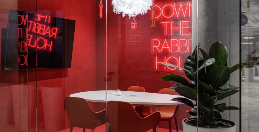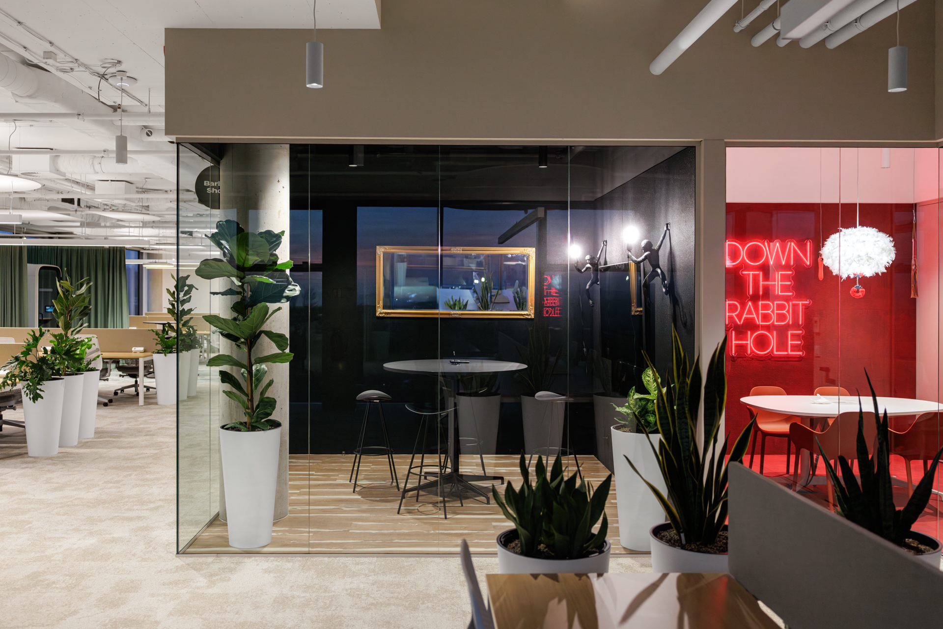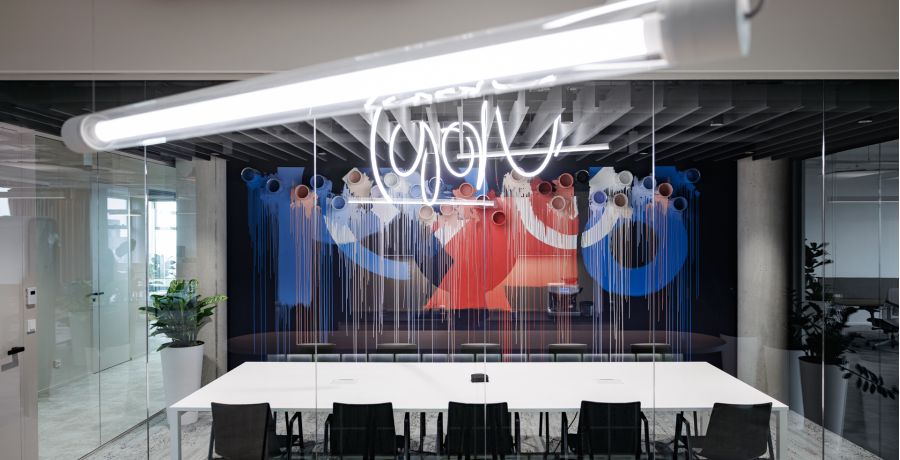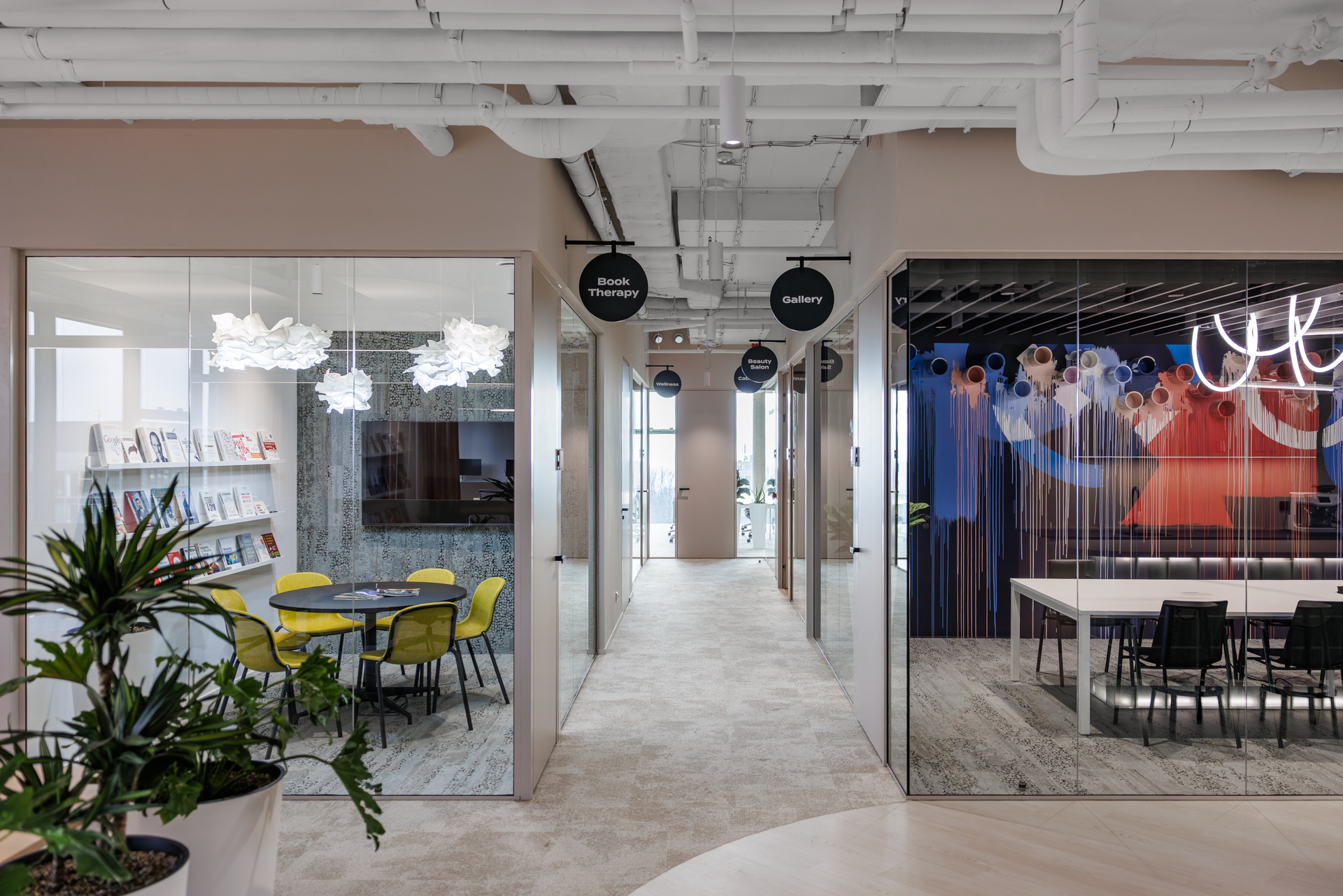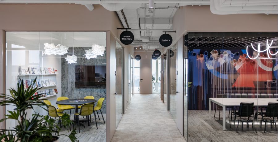 Jednotlivé zasedací místnosti jsou pojaty jako svébytné městské podniky s vlastní atmosférou a identitou – od galerie přes wellness až po cabaret – a orientaci v prostoru usnadňují výrazné vizuální prvky a hravá práce se světlem.