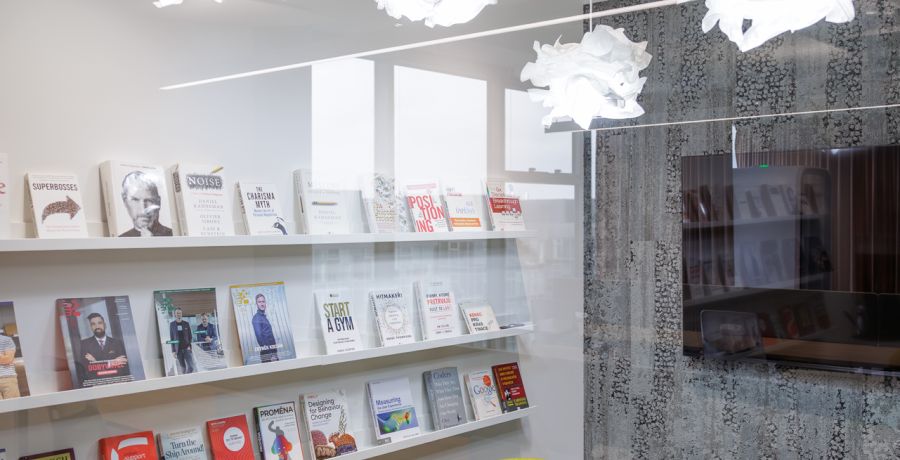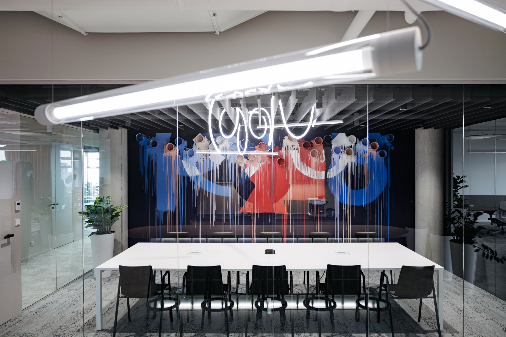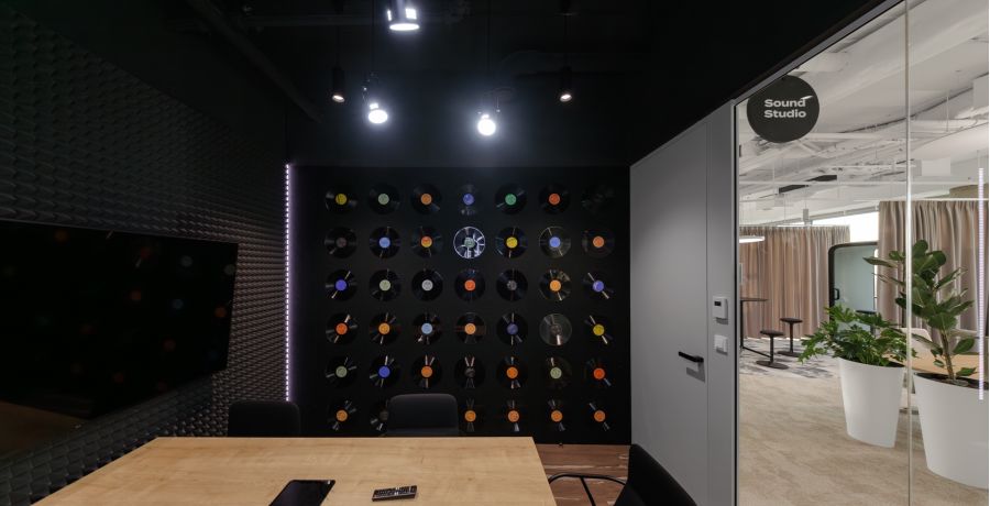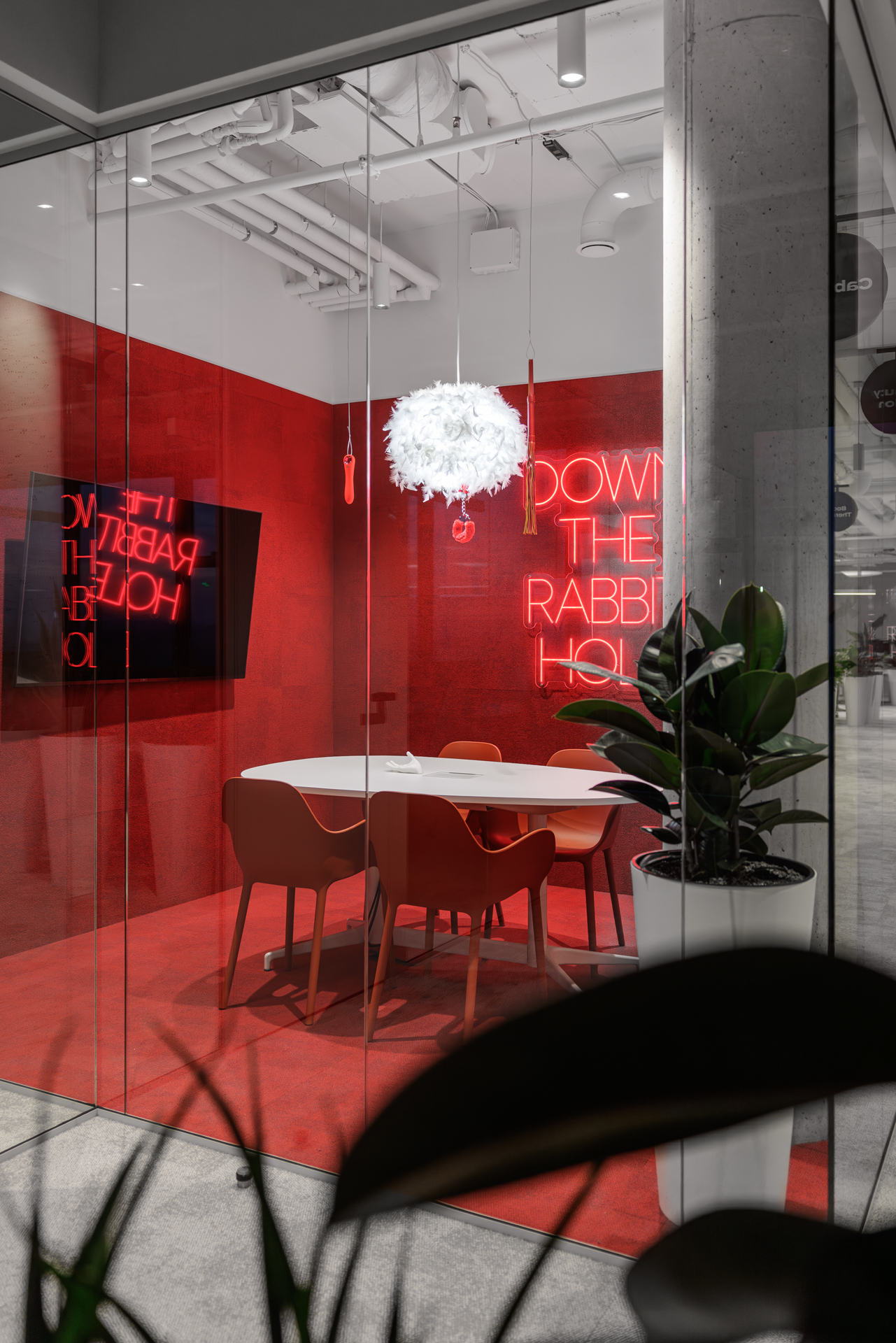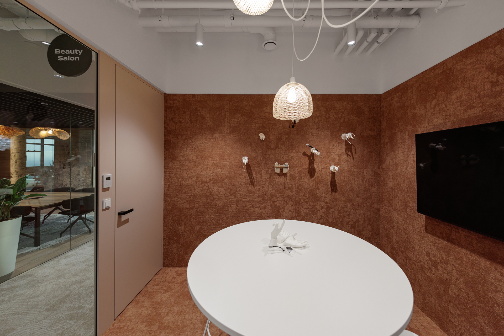 Jednotlivé zasedací místnosti jsou pojaty jako svébytné městské podniky s vlastní atmosférou a identitou – od galerie přes wellness až po cabaret – a orientaci v prostoru usnadňují výrazné vizuální prvky a hravá práce se světlem.