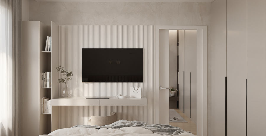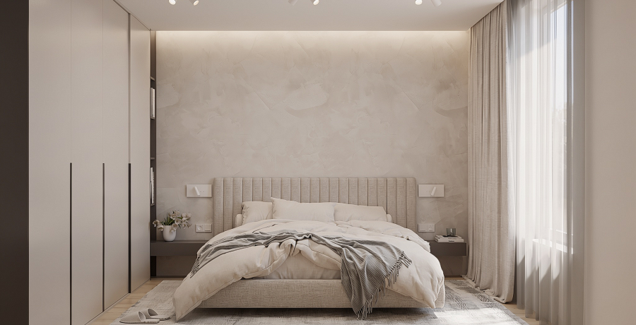 Interiér pro mladý pár je navržen v jemných odstínech s cílem čistého minimalismu.
